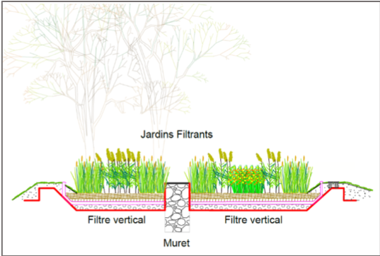 Les eaux du bassin traverseront le Jardin Filtrant® (filtres verticaux puis filtre horizontal) pour s’enrichir en oxygène et filtrer les pollutions. Cette filtration naturelle est assurée par ces filtres plantés conçus comme des zones naturelles humides de type roselières.