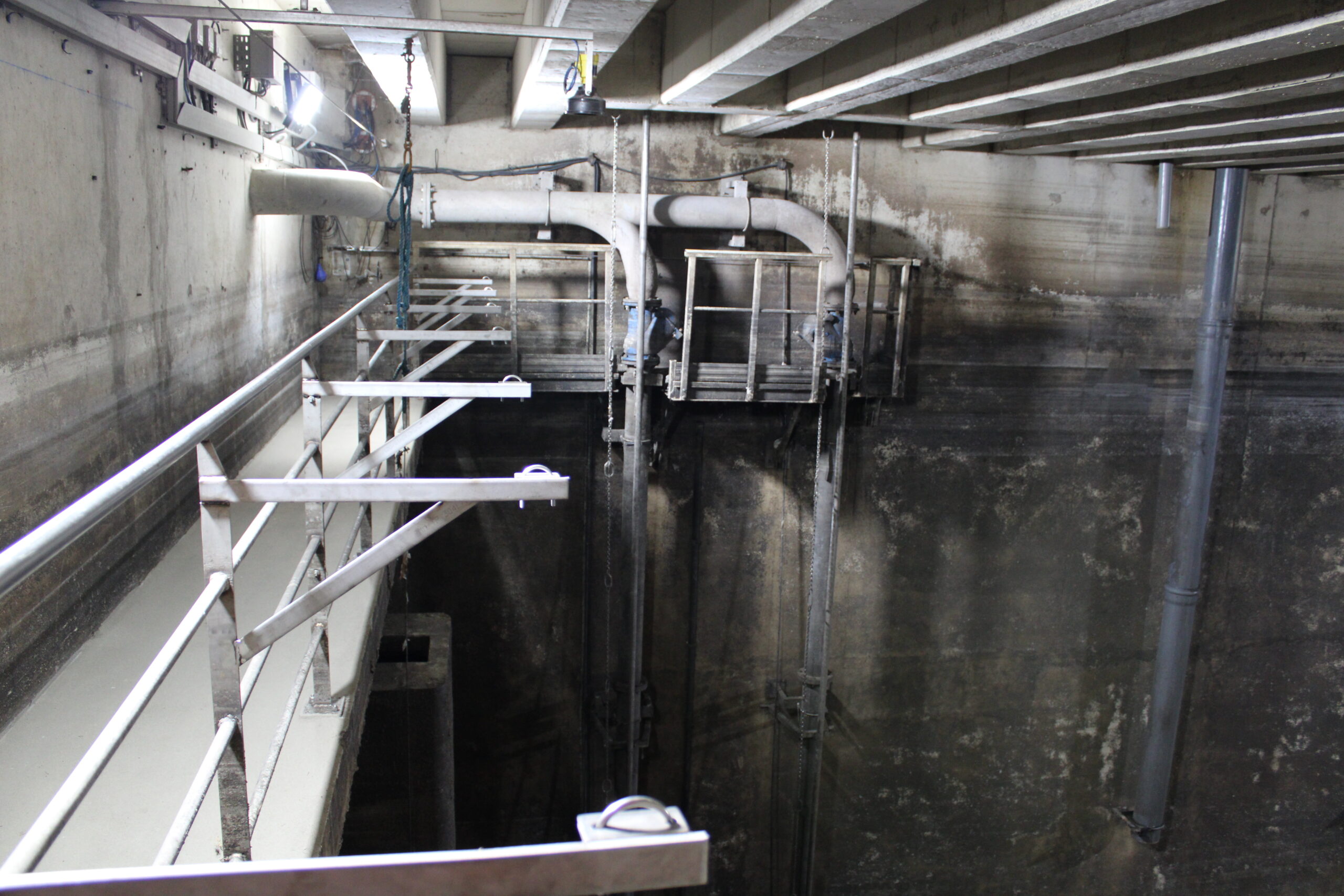 4) Arrivée des eaux usées dans la bâche de refoulement. Les eaux y sont stockées en attendant d’être acheminées petit à petit vers la station d’épuration. La capacité de la bâche est de 2000 m3.