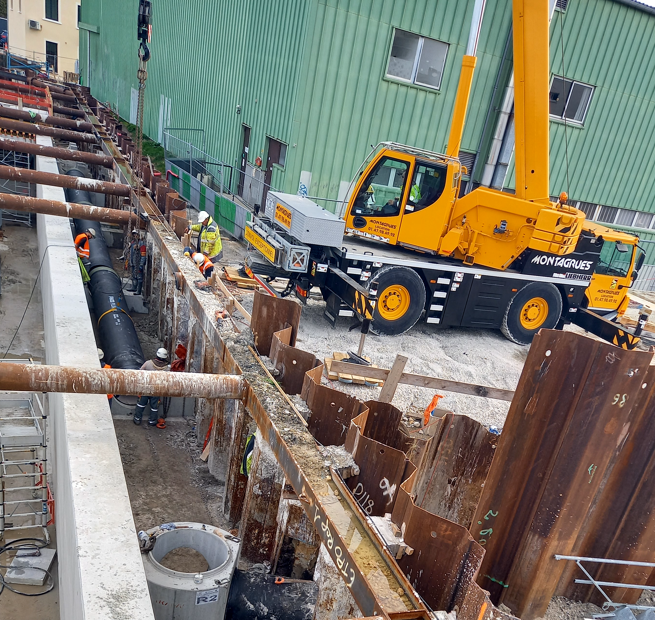 Le dernier tronçon du bypass a été posé. Cette canalisation de 800mm de diamètre permettra de dévier les pollutions liquides (hydrocarbures, eaux chargées) de la sortie du dalot vers le réseau unitaire (canalisation mélangeant eaux pluviales et aux usées) déjà existant sous l’avenue Kellermann. Ainsi, les pollutions seront évitées avant que l’eau ne soient rejetées dans le milieu naturel (ici le lac d’Enghien-les-Bains).