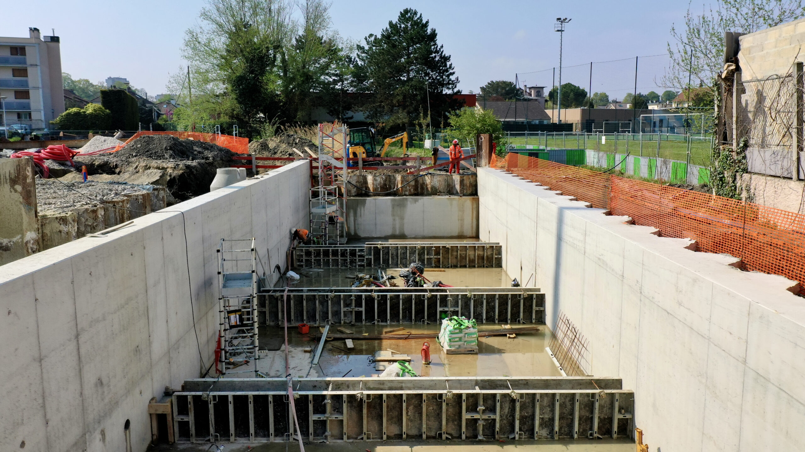 Suite à des contraintes géologiques rencontrées lors de la réalisation des travaux au niveau du futur bassin de décantation, et après concertation avec nos experts en géotechnique, la construction d’un fond injecté en ciment (radier) s’est avérée nécessaire. Ces travaux ont pour but de protéger la nappe de Saint-Ouen qui alimente les thermes d’Enghien-les-Bains et ainsi, éviter les pompages non-appropriés dans le secteur.