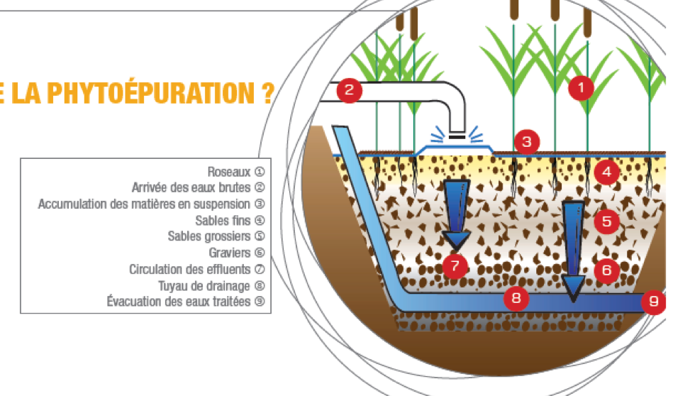 Les eaux passent à travers des bassins remplis d’un substrat minéral (sable, gravier, pouzzolane selon les cas) où sont plantés différents végétaux sub-aquatiques : roseaux, massettes, joncs, iris….Ces plantes, et plus spécifiquement les roseaux (Phragmites) drainent, apportent de l’oxygène et servent de support aux bactéries aérobies. Ces bactéries, ainsi que la macrofaune du sol (lombrics…), ont un rôle de dégradation et de minéralisation de la matière organique, qui devient dès lors assimilable par les plantes. Ainsi le système produit peu de boues.