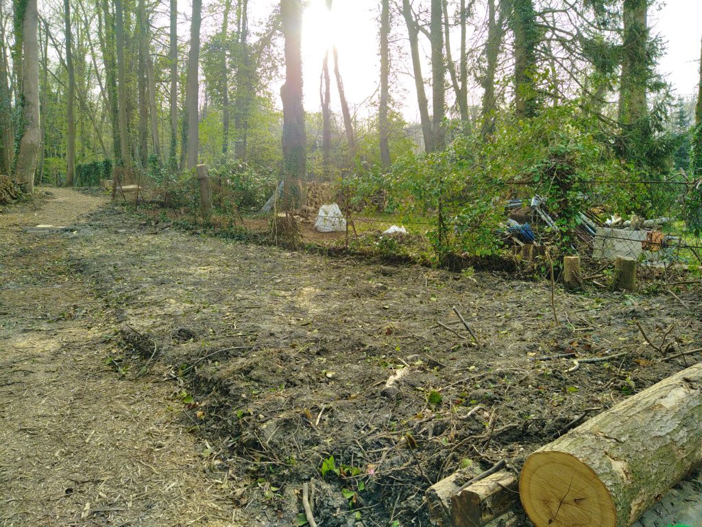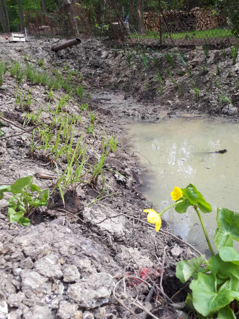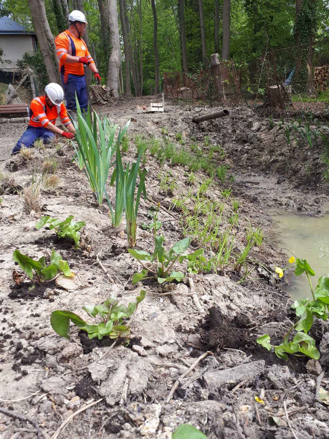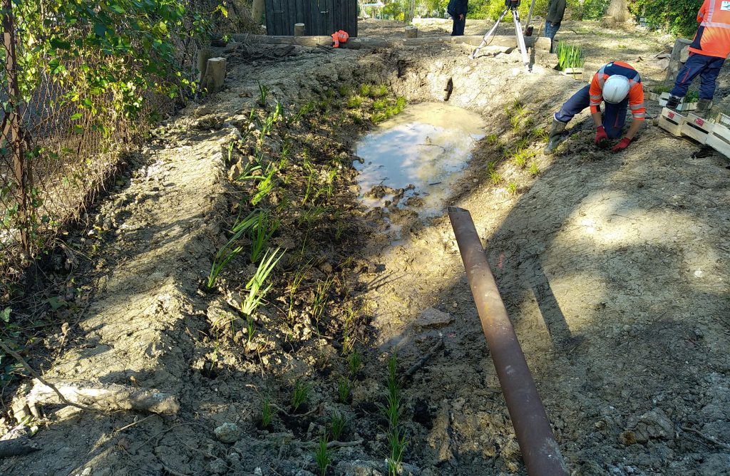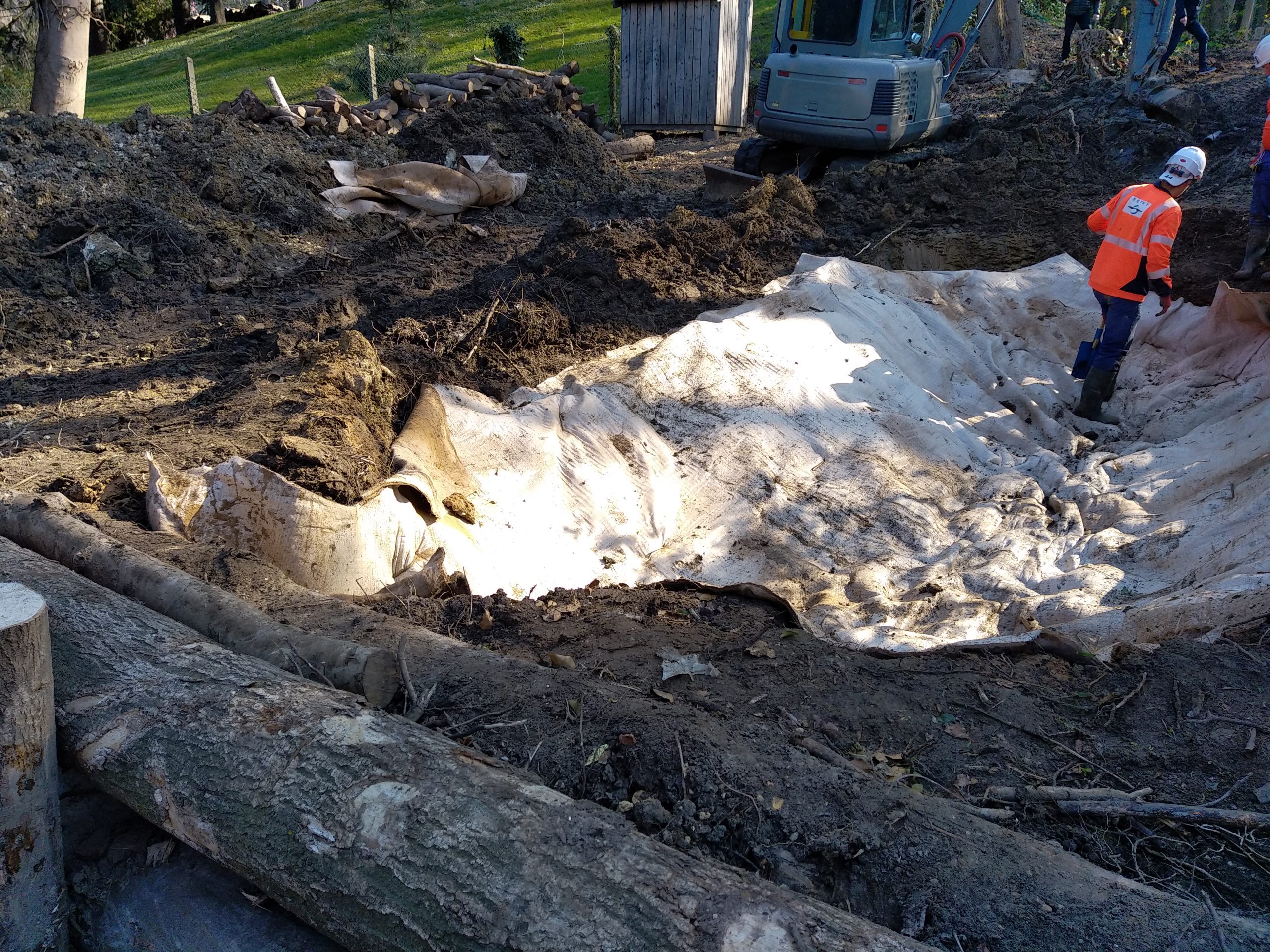- Travaux de création d’une mare écologique d’environ 40 m², imperméabilisée à l’aide d’une bâche bentonite (argile) puis végétalisée (plantes hélophytes), par les entreprises FOREM et SETHY, du 12 au 30 avril 2021