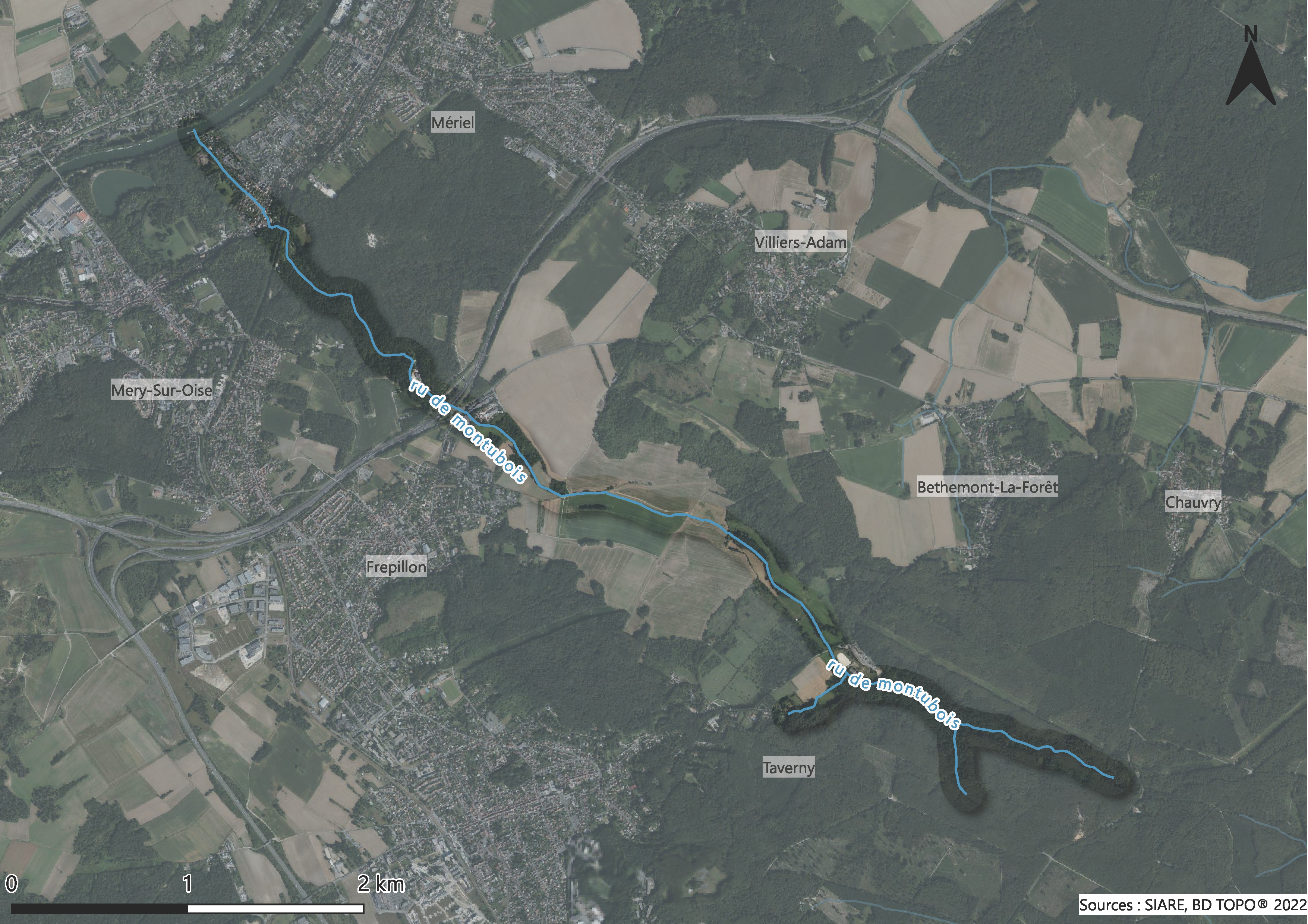 Long de 5 km et très morcelé, le ru du Montubois prend sa source à Chauvry dans la réserve biologique dirigée de la Cailleuse en forêt de Montmorency. Situé entre 3 zones géographiques distinctes (zone forestière et agricole en amont, zone urbaine en aval), ce petit filet d’eau qui sépare les villes de Béthemont-la-Forêt, Taverny, Frépillon et Villiers-Adam, fait partie du bassin versant de l’Oise. Il se jette dans l’Oise à proximité du lieu-dit Le Bac à Méry-sur-Oise.
